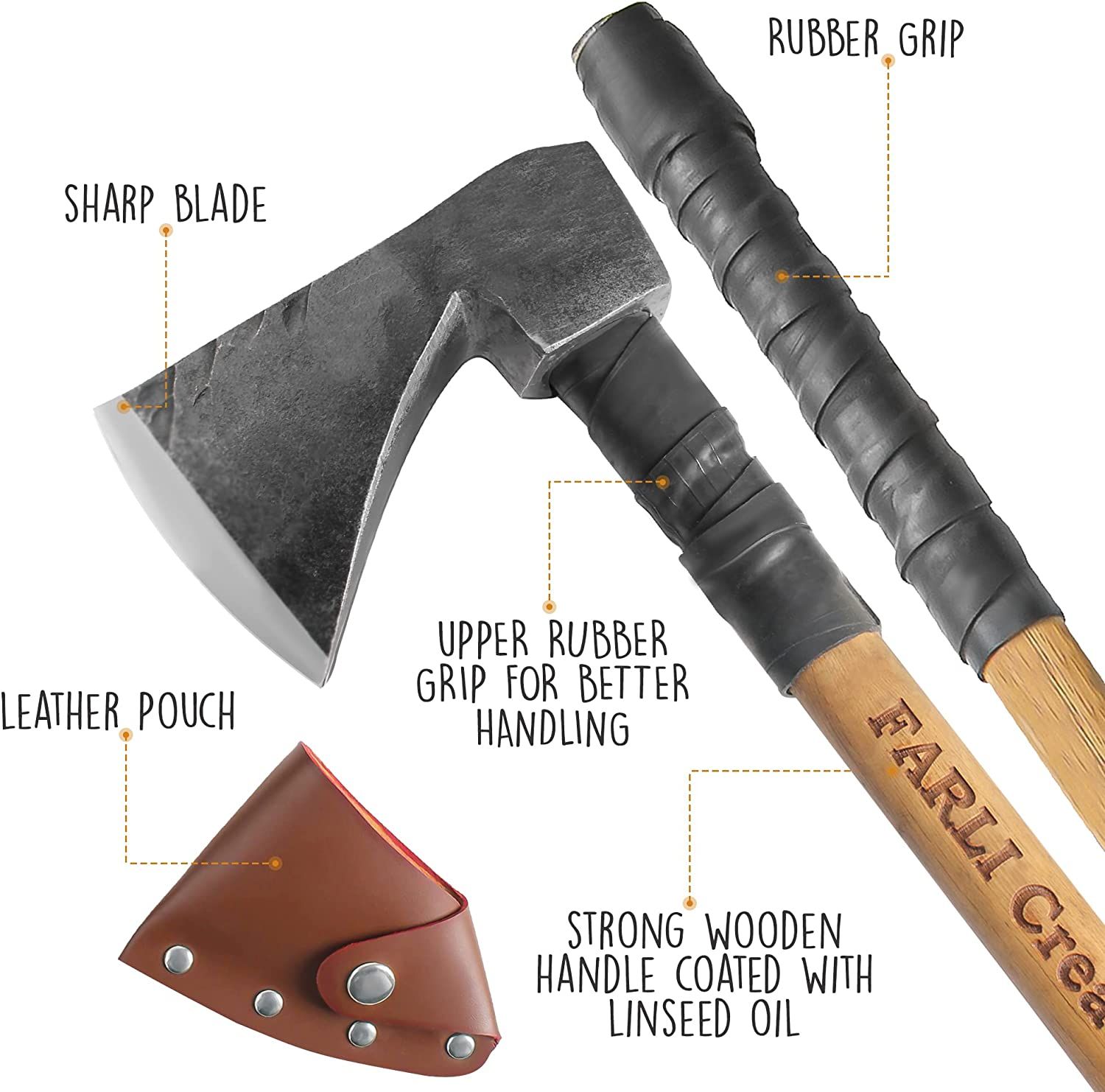 Learn More Farli M27 Splitting/Chopping Axe 27", Sharp Carbon Steel Blade, Leather Sheath, Forest Hatchet, Camping Axe, Strong Polished Wooden Handle with Anti Slip Grip